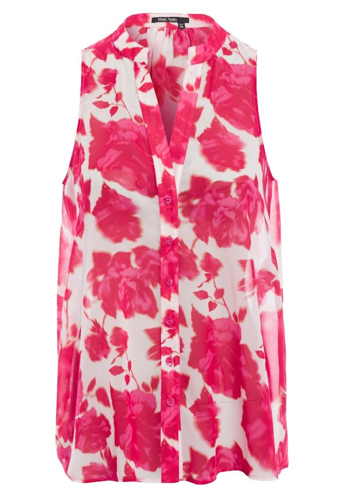 Leicht, feminin und absolut stilvoll – diese ärmellose Bluse ist ein echtes Highlight für Deine Sommergarderobe! Der zarte Rosenprint bringt romantische Leichtigkeit in jeden Look und macht die Bluse zum idealen Kombipartner für elegante wie lässige Outfits.